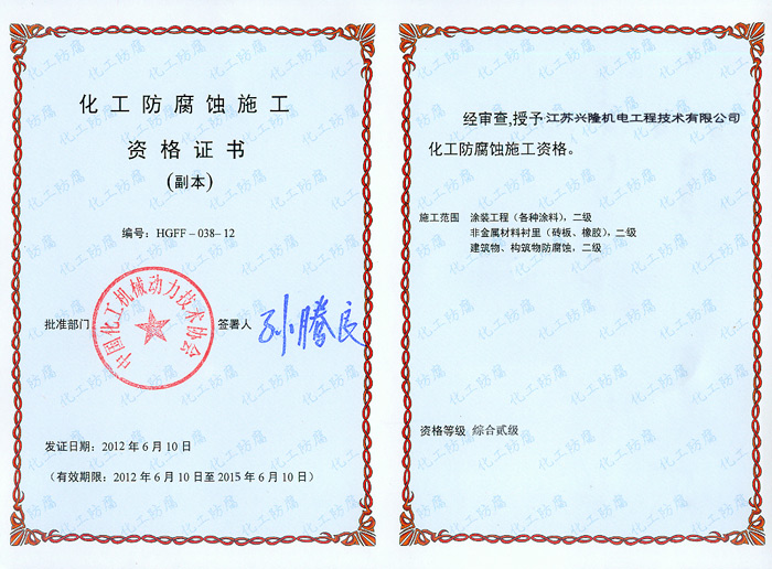 化工防腐資質證書